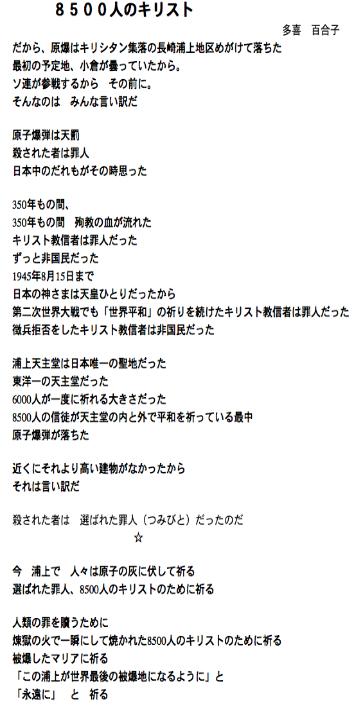 "Leí recientemente el trabajo de Taki Yuriko, un poeta contemporáneo quién utilice imágenes y conceptos cristianos. En su libro “8500 Christs’ (stand@rt, 2003) ella tiene muchos poemas móviles sobre la Segunda Guerra Mundial, incluyendo El Puente Sobre El Río Kwai, Hiroshima y Auschwitz, y sobre acontecimientos más últimos tales como Chernobyl. El autor dice que ella espera que poder hablar de los problemas más difíciles con intenciones verdaderas."