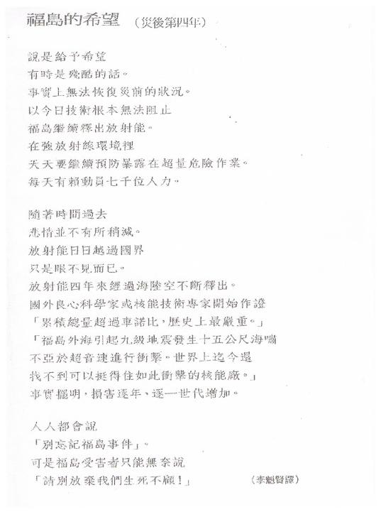 By Taki Yuriko Government promises Can kill. The reality is There will be no pre-accident Fukushima. Our best techniques cannot even halt Fukushima’s current radioactive output. Daily stopgap work continues Just to prevent more accidents. Our survival still depends daily on a 7000-person workforce. Time does not Heal all wounds. Radiation leaks unseen Across national borders every day. Even after four years, radioactive emissions have continued unabated into the land, sky and sea. Expert opinions have begun coming in From ethical scientists and nuclear plant engineers abroad. “The aggregate radiation level has already surpassed that of Chernobyl, making it the worst in history.” “The 15-meter-high tsunami generated by the magnitude 9 earthquake that occurred off the coast of Fukushima delivered its impact with a velocity greater than that of the speed of sound. There is no nuclear plant of this grade worldwide that can withstand such force.” The damage will worsen with each passing year, with each generation, And finally become manifest. Everyone else is saying, “We will not forget Fukushima.” But the Fukushima victims say, “Don’t leave us for dead.” |