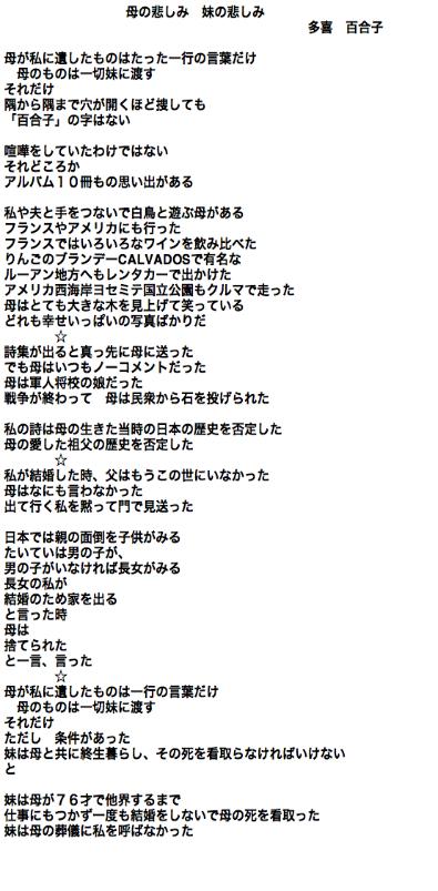 “Dejo todas mis mercancías mundanas a la hija más joven.” Nada más. Aunque leí cuidadosamente el testamento, “Yuriko” nunca fue mencionado. La madre y yo nunca incluso habíamos peleado, Y tengo valor de diez álbumes de memorias encariñadas. Mi marido e yo que llevan a cabo las manos mientras que la mamá acaricia un cisne. Viajando a Francia, América. Vinos franceses que intentan Y brandy de la manzana de Calvados. Normandía que explora en un coche de alquiler. Ver la costa del oeste de América y de Yosemite. Mamá que mira para arriba un árbol enormes y reír. Todas las imágenes llenaron de felicidad. Cuando mis poemas fueron publicados, los envié inmediatamente a la madre. Ningún comentario. La hija de un militar de alto-alinea, Ella esquivó las piedras lanzadas por los civiles después de la guerra. La madre idolized los días de la preguerra, Los días de su querido, mi abuelo. Pero mi poesía los denigró. Cuando casé, fueron a mi padre, el único hombre, ya. Pero la madre nunca me reprobó. Ella dio mi mano sin queja. En Japón, los niños toman el cuidado para sus padres. Generalmente, los hijos lo hacen. Si no él caídas a la más vieja hija. Cuando declaré, “estoy saliendo del hogar para casar,” La madre debe haber concluido, “He side desechado.” Mi herencia era una sola línea. “Dejo todas mis mercancías mundanas a la hija más joven.” Nada más. “A condición de que ella se dedica a mí hasta muerte nos separa .” Mi hermana nunca casada; ella cuidó para la madre hasta su muerte. Y ella no me invitó al entierro. Traducido a espanol por Sophia & Michael Dediu |